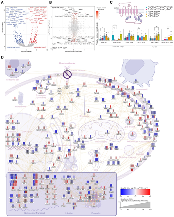 (A) 与 PK-Insr w/w小鼠相比,PK- Insr f/f小鼠中具有显著上调或下调的磷酸位点的蛋白质的火山图。(B) 与 PK- Insr f/f小鼠和 PK- Insr w/w小鼠之间相应蛋白质丰度的变化相比,磷酸肽丰度的变化。(C) 上:Cckar 上磷酸化位点的示意图,这些位点在任何比较中都存在差异丰富。下:所有样品和基因型的每个检测到的磷酸肽的相对磷酸肽丰度。(D) 不同丰度磷酸位点及其相应蛋白质的细胞内位置和功能。