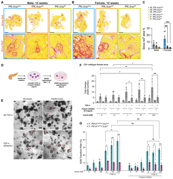 (A-B) 12 周龄雄性和雌性胰腺的染色的代表性全切片。(C) 每个基因型和雄性/雌性小鼠的Sirius red阳性区域的定量。(D) 使用 3D 腺泡细胞外植体系统进行 ADM 形成测定的实验设计示意图。(E)腺泡细胞聚类和导管形成(环形结构)的代表性明场图像。(F)原代小鼠腺泡细胞3D外植体(CD1雌性)中ADM的倍数差异进行定量。(G) 每孔所有腺泡聚类的 ADM 转化率的量化。