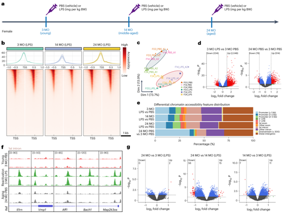 为了探索在整个生命周期中控制小胶质细胞转录动力学的潜在机制,他们通过转座酶可及的染色质测序(ATAC-seq)对幼年(3个月),中年(14个月)和老年(24个月)阶段的雌性小胶质细胞的染色质可及性进行分析(图3a)。