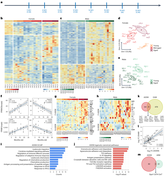 (a) 小胶质细胞bulk RNA-seq分析方案。(b-c) 雌性和雄性小鼠衰老过程中小胶质细胞 DEG 的热图。(d-e) 雌性和雄性小鼠衰老过程中小胶质细胞表型的 PCA 图。 (f) 散点图显示与衰老过程相关的代表性基因的线性回归。 (g-h) 雌性和雄性小鼠衰老过程中 ADEM 基因的热图。 (i) GO 注释的 ADEM 基因的前 10 个显著富集的 BP。 (j) IPA注释的前10个典型通路显著富集ADEM基因。(k) 维恩图显示了在ADEM和DAM基因集之间重叠的21个基因。 (l) 散点图显示ADEM和DAM基因集之间重叠基因的log2 FC的线性回归,揭示它们是正相关的。 (m) 维恩图显示 ADEM 和 ARM 基因集之间只有三个基因重叠。