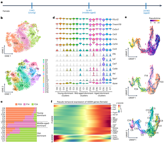 (a) 幼年(3 MO)、中年(14 MO)和老年(24 MO)雌性小鼠的小胶质细胞 scRNA-seq 方案。(b) 幼年(3 MO)、中年(14 MO)和老年(24 MO)小胶质细胞的 tSNE 图。(c) 三个年龄段小鼠细胞中的优势聚类。(d) 小提琴图显示了每个聚类中14个小胶质稳态相关基因和炎症相关基因的表达水平。(e) 三个年龄段小胶质细胞的伪时间轨迹。 (f) 热图显示与伪时间相关的ADEM基因的表达水平。