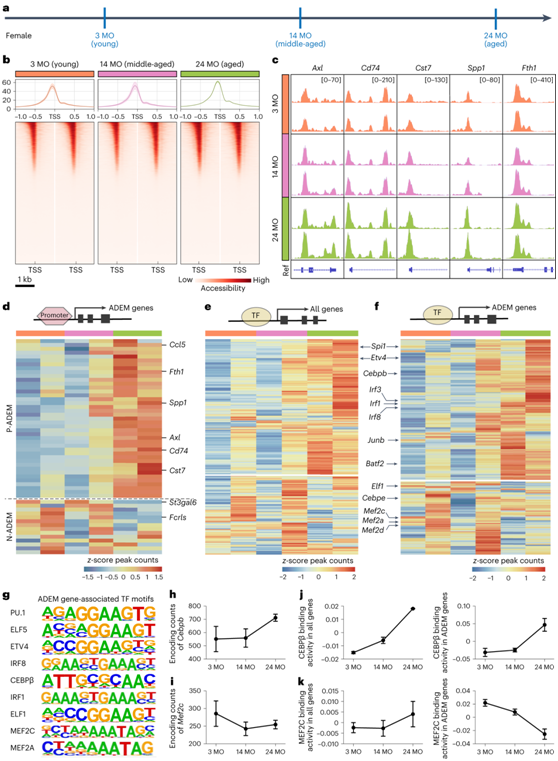 (a) 幼年(3MO)、中年(14MO)和老年(24MO)小鼠的小胶质细胞ATAC-seq方案。(b) ATAC 在三个年龄时在小胶质细胞的 TSS(−1 kb 至 1 kb)周围达到峰值。(c) 代表性基因组浏览器视图,显示Axl、Cd74、Cst7、Spp1和Fth1的 ATAC 峰。(d) ADEM 基因差异可及性染色质启动子区域的热图。 (e-f) 所有基因和 ADEM 基因的差异可及性TF 基序的热图。 (g) ADEM 基因相关 TF 基序的序列标识。(h-i) 折线图显示 TF 编码基因Cebpb(随年龄上调)和Mef2c(随年龄下调)的峰值计数。 (j-k) 折线图显示CEBPβ和MEF2C