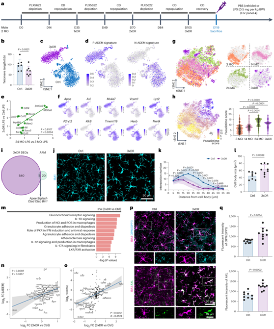 (a) 3xDR 方案和实验时间点。 (b) 3xDR 缩短小胶质细胞端粒。 (c) 3xDR 小胶质细胞表现出与对照小鼠不同的转录特征。(d) 3xDR小胶质细胞表现出较高的P-ADEM和较低的N-ADEM基因特征得分。(e) 3xDR与对照小胶质细胞FC (qPCR)在衰老与幼年小胶质细胞FC (bulk RNA-seq)中表现出类似的趋势。(f) tSNE 图显示小胶质细胞激活相关和稳态相关基因的表达水平。(g) 3xDR小胶质细胞表现出与衰老小胶质细胞相似的表型。 (h) 3xDR 和 24 个月大的小胶质细胞表现出比 3 个月大和 14 个月大的小胶质细胞更高的伪时间值。(i) 3xDR DEG 和 ARM 基因集之间只有 5 个基因重叠。(j-l) 3xDR 小胶质细胞表现出独特的形态。 (m) 与 IPA 注释的对照小胶质细胞 DEG 相比,前 10 条显著富集的 3xDR 经典通路。 (n-o) 3xDR 与对照小胶质细胞 FC 与 ADEM 和 DAM 基因集呈正相关。(p-q) 代表性共焦图像显示 OPN 和 AXL 在 3xDR 小胶质细胞中上调。