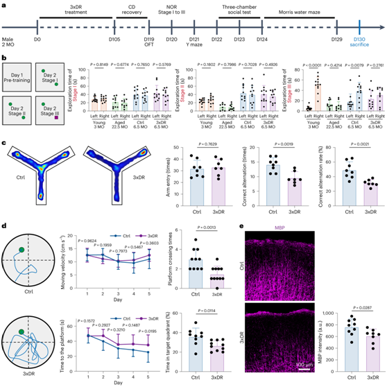 (a) 3xDR 小鼠的实验方案。(b) NOR显示3xDR会导致识别记忆的认知能力下降,类似于老年小鼠的表型。(c) Y 迷宫揭示 3xDR 会导致空间学习认知能力下降。(d) 莫里斯水迷宫揭示3xDR导致空间学习认知能力下降。 (e) 皮质中 MBP 的代表性共焦图像以及对照和 3xDR 小鼠大脑中平均 MBP 表达的量化。