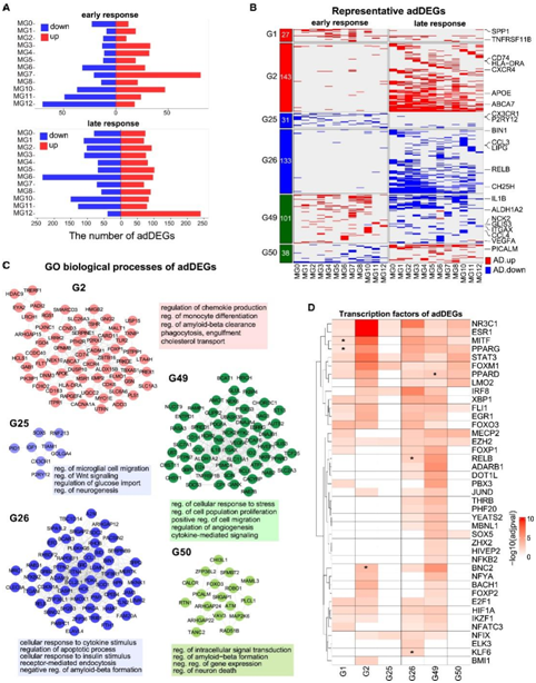 (A) 条形图显示早期反应和晚期反应中每种小胶质细胞状态下调和上调的 DEG 数量。(B) AD 进展过程中八组中 473 个 DEG 的转录变化。(C)图5B中每组基因的基因-基因网络。(D) 热图显示每组中 DEG 的 TF 富集。