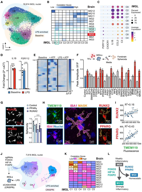 (A) 18914 个 iPSC 衍生的小胶质细胞 (iMGL) 细胞核的 UMAP。(B) 从人类死后 snRNA-seq 数据中富集小胶质细胞转录状态中每个聚类的 iMGL 标记基因。(C) 点图显示 iMGL 聚类中标记基因的表达。(D) 10 ng/mL LPS 处理 12 小时后,对 iMGL 中 IL1B 和 P2RY12 表达进行 qPCR 分析。(E)单培养iMGL在基线或在405 nm刺激下ATP释放后钙瞬态的栅格图。(F) 病毒感染后 8 天,暴露于神经元球体 CM 以诱发钙瞬变,进行 TF 过度表达筛选。(G) RUNX2 和 PPARG 过表达和形态学定量的肌动蛋白染色。(H) 人脑组织稳态标记物 TMEM119 和泛巨噬细胞标记物 IBA1 的免疫染色。(I) 将 IBA1 阳性细胞中 PPARG 和 RUNX2 水平与稳态标记 TMEM119 相关的回归分析。(J–K) 来自用 LPS 的靶向FOXO3、HIF1A和FOXP2的 sgRNA 处理的 CRISPRi iMGL 的 UMAP 。(K) 从人类死后 snRNA-seq 数据中富集小胶质细胞转录状态中每个聚类的 LPS 处理的 iMGL 基因。(L) 小胶质细胞状态转变动力学图。