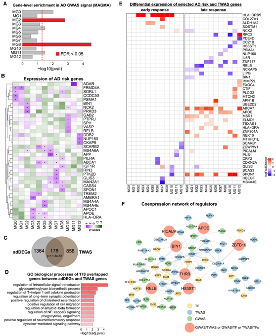 (A) 使用 MAGMA 对 GWAS 信号进行基因水平富集,以将小胶质细胞状态与 AD 遗传学相关联。(B) 12 个小胶质细胞状态中 AD 最高风险基因的表达模式。(C) 维恩图显示 DEG 和 TWAS 基因之间的显著重叠。(D)GO分析。(E) 每个小胶质细胞状态下 AD 早期和晚期 44 个 AD 风险基因或 TWAS 基因的转录变化。(F)调控因子的共表达网络。