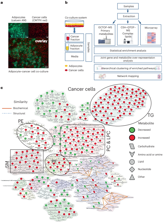 (a) 荧光 (CMTPX) 标记的 OvCa 细胞(红色)与钙黄绿素 AM 标记的原代人网膜脂肪细胞(绿色)共培养。(b) 共培养脂肪细胞和 OvCa 细胞的多组学分析示意图。(c) 网络图显示脂肪细胞共培养时 SKOV3ip1 细胞中代谢物水平的改变(红色,增加;绿色,减少)。