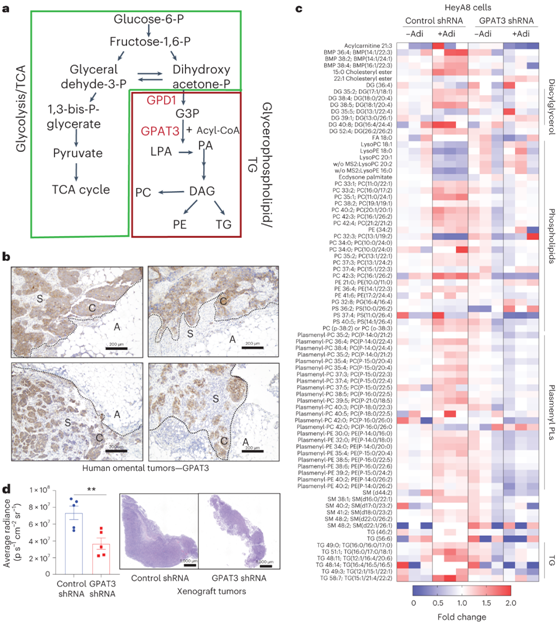 (a) 示意图:GPAT3 催化 GPL 和 TG 合成的初始步骤。 (b) 高级别浆液性OvCa转移性网膜肿瘤患者连续切片中的GPAT3表达。(c) 对照和GPAT3 shRNA OvCa细胞与网膜脂肪细胞共培养18小时的脂质组学分析。(d) 左:将具有稳定对照或 GPAT3 敲低的 HeyA8-荧光素酶 OvCa 细胞腹腔注射到裸鼠中,随后使用 IVIS 光谱体内成像系统进行成像。右:整个网膜肿瘤的 H&E 染色切片。