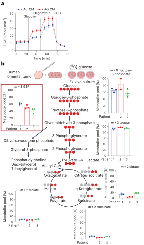 代谢组学数据表明,PC 丰度的增加是脂肪细胞共培养癌细胞的主要变化。整合的基因表达/代谢物分析还表明,与脂肪细胞共培养的癌细胞中糖酵解活性增加。脂肪细胞源性条件培养基 (Adi CM) 增加了两种 OvCa 细胞系的细胞外酸化率 (ECAR),显示糖酵解率显著增加(图 2a)。为了追踪脂肪 TME 中肿瘤组织中葡萄糖衍生碳的流动,他们对从三名晚期高级别浆液性 OvCa 患者获得的人网膜外植体进行了稳定同位素示踪分析。将邻近脂肪细胞的癌组织在含有[U-13C]-葡萄糖的培养基中离体培养24小时,并分析中心碳代谢物的13C富集谱(图2b)。他们发现在三羧酸循环(TCA)循环中间体中,m + 6果糖-6-磷酸和m + 3乳酸具有高标记性,而(m + 2同位素)具有低标记性。在TCA循环中间体中未检测到同位素标记,表明葡萄糖衍生碳在三羧酸循环中不存在。因此, OvCa细胞减少了葡萄糖衍生的碳进入TCA循环(图2b)。然而,肿瘤外植体在 G3P 中具有大量标记的同位素,G3P 是 TG 和 GPL 的主干(图2b)。他们观察到溶血磷酸胆碱 18:1 中的m + 3 标记升高,而其他同位素异构体(m + 4 至m + 26)中几乎没有检测到标记。