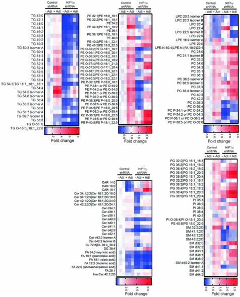 HIF1α 敲低阻断了大多数脂肪细胞诱导的三酰甘油、P和醚连接的 P,以及其他膜脂,如鞘磷脂和神经酰胺(图S6)。因此,脂肪细胞诱导的 HIF1α 驱动的转录程序调节癌细胞中 GPL 和 TG 合成的葡萄糖利用。