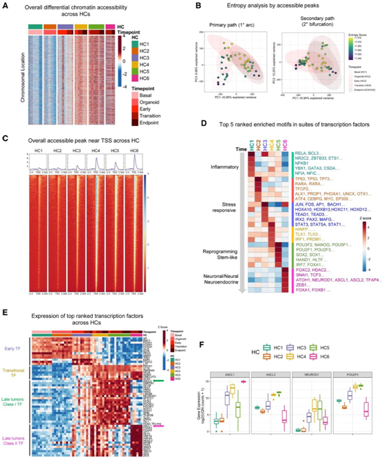 (A) HC 中染色质可及性的总体差异。(B) 使用 ATAC-seq通过熵分析对 PARCB 时程样本的染色质可及性进行 PCA。(C) PARCB 时间过程研究中每个 HC 的 TSS 附近的总体平均可及性。(D) 使用 ATAC-seq从每个 HC 中的转录因子中富集的基序。(E) 使用bulk RNA-seq 在 PARCB 时间过程中排名最高的转录因子和已知的神经内分泌转录因子。(F) 每个 HC 中 ASCL1、ASCL2、NEURDO1 和 POU2F3 的表达。