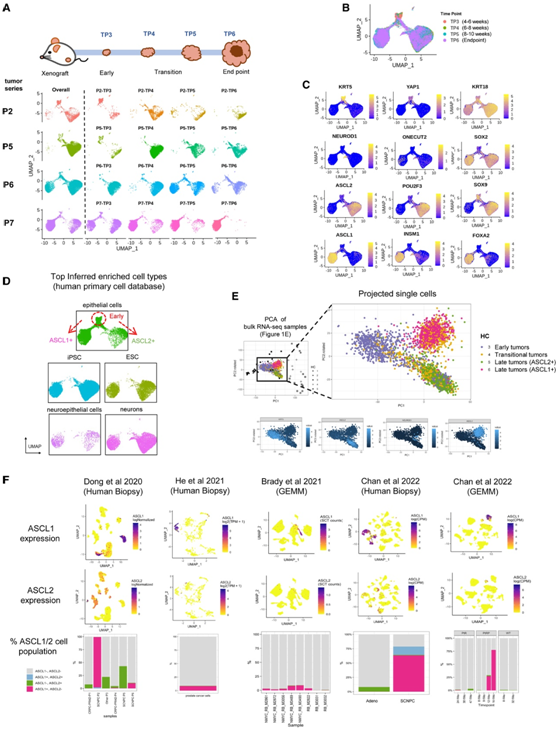 (A) 使用scRNA-seq 对P2、P5、P6 和 P7进行UMAP可视化分析。(B) 所有样本的时间 UMAP 可视化。(C) 选定标记和转录因子的表达。(D) 使用 SingleR 从人类细胞类型数据库中推断出最富集的细胞类型。(E) 通过bulk RNA-seq样本(上)在 PCA 框架上投影scRNA-seq样本以及所选标记和转录因子的表达(下)。(F) 来自五个scRNA-seq数据集的人体活检和 GEMM 模型肿瘤中 ASCL1(上)和 ASCL2(中)的表达以及 ASCL1/2 阳性细胞(表达值 > 0 的细胞)(下)的百分比。
