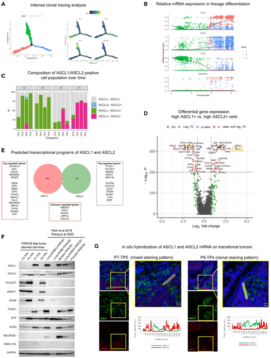 (A) 使用 Monocle 2 对 PARCB 时间过程样本进行推断克隆追踪分析。(B) 推断克隆追踪分析中 KRT5、ASCL1 和 ASCL2 的相对表达(伪时间)。(C) ASCL1 或 ASCL2 阳性、双阳性和双阴性细胞群随时间变化的百分比。(D) 高 ASCL1+ 与高 ASCL2+ 细胞群中差异表达基因的火山图。(E) 来自预测的 ASCL1 和 ASCL2 转录程序的代表性基因,根据来自患者和模型前列腺癌肿瘤的数据进行训练。(F) 免疫印分析。(G)ASCL1 和 ASCL2 的mRNA原位杂交分析。