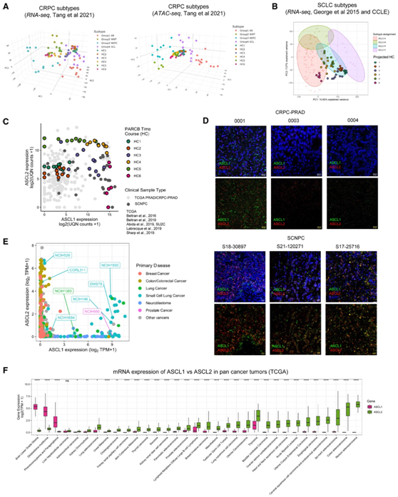 (A) 使用 RNA 测序(左)和 ATAC 测序(右)在 CRPC 亚型定义的 PCA 框架上投影 PARCB 时间过程样本。(B) PARCB 时间过程样本在 SCLC 子类型定义的 PCA 框架上的投影。(C) PARCB 时程样本和多组临床 CRPC-PRAD 和 SCNPC 样本(包括 TCGA 和不同研究组)中 ASCL1 和 ASCL2 的 mRNA 表达。(D)临床 SCNPC 组织中 ASCL1 和 ASCL2 的原位RNA 杂交的代表性图像。(E) ASCL1 和 ASCL2 在泛癌细胞系 (CCLE) 中的 mRNA 表达。(F) TCGA 中泛癌肿瘤中 ASCL1 和 ASCL2 的 mRNA 表达。