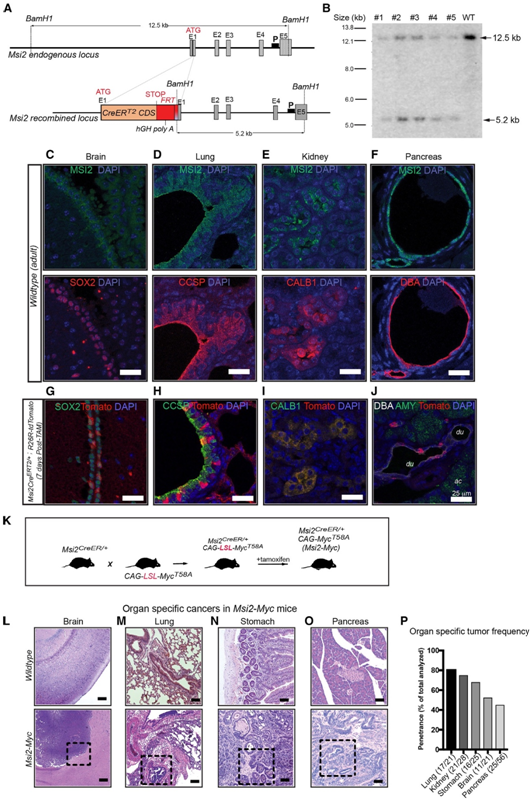 (A)具有CreERT2编码序列(CDS)的野生型和重组Msi2等位基因克隆到Msi2的ATG位点示意图。(B)与野生型(WT)相比,杂合子的目标等位基因小鼠组织的Southern blot。(C-F)脑组织 (SOX2, C)、肺(CCSP, D)、肾脏(CALB1, E) 和胰腺 (DBA, F)中MSI2(绿色,上)和组织特异性标志物(红色,下)的表达。(G-J) tdTomato的表达分析。(K) Msi2-Myc小鼠模型的建立方案。(L-O)野生型正常组织(上)和Msi2-Myc小鼠肿瘤组织(下)的组织学分析。脑(L),肺(M),胃(N)和胰腺(O)。(P) Msi2-Myc模型的肿瘤外显率。