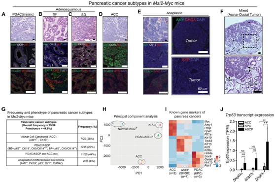 (A-E)使用谱系特异性标志物确定肿瘤亚型。(F)腺泡-导管混合性肿瘤组织学分析。(G)Msi2-Myc小鼠肿瘤亚型的总体频率和表型。(H) MSI2+胰腺细胞、ACC和PDAC/ASCP肿瘤细胞的主成分分析。(I) Msi2-Myc ACC和ASCP的分类标记热图。(J)柱状图显示△Np63 (Trp63)变异在ACC、ASCP和PDAC (KPC)胰腺肿瘤中的表达。