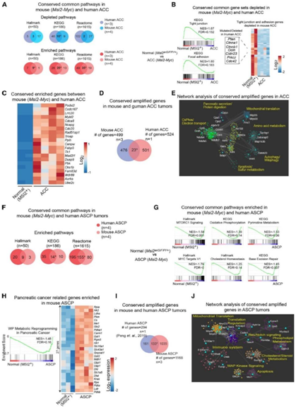 为了确定Msi2-Myc模型胰腺肿瘤与人类疾病之间的一致性,他们比较了转录组学和基因组特征。人类和小鼠ACC肿瘤的转录组学比较揭示了富集和缺失通路的保守性(图3A)。在人类ACC中通常缺失的基因,也在小鼠ACC中发生缺失(图3B)。虽然小鼠和人类ACC肿瘤之间有许多不受调控的通路,但在小鼠和人类ACC中,富集和缺失的基因在基因水平上的保守性较低(图3C)。基因组水平分析显示,小鼠和人类ACC中扩增基因在自噬、氨基酸代谢、氧化磷酸化和凋亡相关程序中具有特异性(图3D-E)。小鼠和人ASCP肿瘤的转录组图显示富集通路的保守性(图3F-G),以及与胰腺癌进展相关的基因集(图3H)。在基因组水平上,小鼠和人类ASCP肿瘤显示出与Ras/Notch信号、MAP激酶信号和凋亡等关键程序调控相关的扩增基因的保守性(图3I-J)。