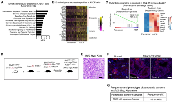 (A) GSEA显示分化的小鼠ASCP肿瘤细胞中最高富集的通路。(B)癌前细胞进展到终末期ASCP时基因表达变化的热图。(C) GSEA显示Kras和Kras相关基因在Msi2-Myc ASCP肿瘤中上调。(D) Msi2-Myc小鼠模型的建立。(E)代表性图像显示广泛的导管肿瘤。(F) 2个独立胰腺导管肿瘤的鳞状肿瘤细胞图像。(G) Msi2-Myc中肿瘤亚型的频率和表型。