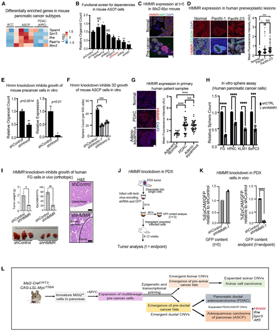 (A)与ACC和KPC PDAC相比,Msi2-Myc ASCP中富集基因的热图。(B) shRNA介导的特定基因抑制对小鼠ASCP细胞类器官生长的影响。(C) Msi2-Myc小鼠典型癌前病变中HMMR表达增加。(D)代表性图像(左)和MFI(右)显示HMMR在人胰腺肿瘤前组织阵列(PanIN)中的表达增加。(E) 左:shHmmr对Msi2-Myc癌前类器官的影响。右:shControl和shHmmr细胞中Hmmr的相对表达量。(F) shHmmr对小鼠ASCP类器官生长的影响。(G)代表性图像和点阵图显示HMMR在人胰腺癌组织阵列中表达的MFI。(H) shHmmr对人ASCP球形成的影响。(I)左:shHMMR在体内对FG细胞的影响,右:代表性染色显示原位移植shControl(上)和shHMMR(下)转导的FG细胞的终末期肿瘤。(J)患者来源的异种移植(PDX)肿瘤细胞体内HMMR敲除示意图。(K) shHMMR对PDX生长的影响。(L)胰腺癌亚型在Msi2-Myc肿瘤模型中的起始和进化模型