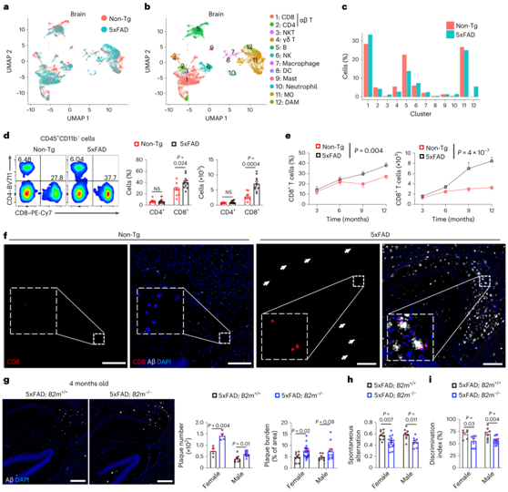 (a-c) 来自8月龄Non-Tg或5xFAD小鼠大脑的CD45int/+CD11b+(主要是小胶质细胞)和CD45+CD11b -非小胶质细胞免疫细胞的scRNA-seq分析。(d) 来自10月龄Non-Tg和5xFAD小鼠的脑CD4+和CD8+ T细胞。 (e) 3、6、9和12月龄时的脑CD8+ T细胞。(f) 12月龄小鼠海马中CD8+ T细胞、Aβ和DAPI的图像。(g) 免疫组织化学分析。(h) Y迷宫测试。(i) 新目标识别测试的量化辨别指数。