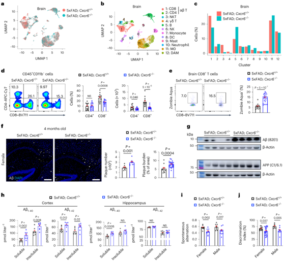 (a-b) 8 个月大 5xFAD 大脑中小胶质细胞和非小胶质细胞免疫细胞的 scRNA-seq 分析。(c) 每个聚类中的细胞频率。(d) 10月龄5xFAD Cxcr6+/+小鼠和5xFAD Cxcr6-/-小鼠脑CD4+和CD8+ T细胞。(e) 非活的(Zombie Aqua+) CD8+ T细胞。(f)免疫组化染色。(g) 免疫印迹分析。(h) 海马和皮质中Aβ1-40和Aβ1-42蛋白的可溶性和不可溶性含量。 (i) Y 迷宫测试自发交替的量化。(j) 新目标识别测试的量化辨别指数。