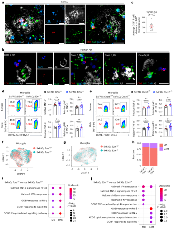 (a) 在10个月大的5xFAD小鼠中,三个独立的成像场描绘了脑CD8+ T细胞(红色0靠近Aβ(白色)和Iba1+小胶质细胞(绿色)。(b) 四个独立的成像场描绘了AD大脑中靠近Aβ(白色)和IBA1+小胶质细胞(绿色)的脑CD8+ T细胞(红色)。(c) AD患者大脑中CD8+ T细胞与小胶质细胞之间的距离。(d-e) TNF-α+小胶质细胞的相对百分比和几何平均荧光强度。 (f-h) 小鼠脑内CD45int/+CD11b+小胶质细胞的scRNA-seq分析。 (i-j) 通过scRNA-seq分析所示小鼠M0和DAM中上调基因的功能富集分析,显示了最高富集通路。