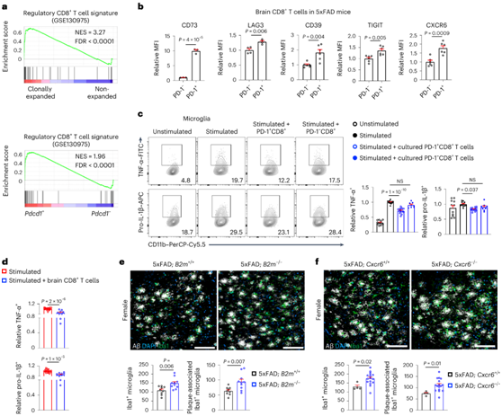 (a) GSEA富集图显示,在克隆扩增的CD8+ T细胞和非扩增的CD8+ T细胞以及Pdcd1+和Pdcd1- CD8+ T细胞中,调节性CD8+ T细胞特征上调。(b) 5xFAD小鼠脑内PD-1+与PD-1 - CD8+ T细胞上指示标记物的相对表达。(c) 小胶质细胞中TNF-α+和前il-1β+细胞与体外扩增的脾源性CD8+ T细胞群共培养。 (d) 单独培养或与来自5xFAD小鼠的新分离的脑CD8+T细胞共培养后,来自5xFAD小鼠的小胶质细胞中的TNF-α+和前IL-1β+细胞。(e-f) Iba1+小胶质细胞或aβ-斑块相关Iba1+小胶质细胞。