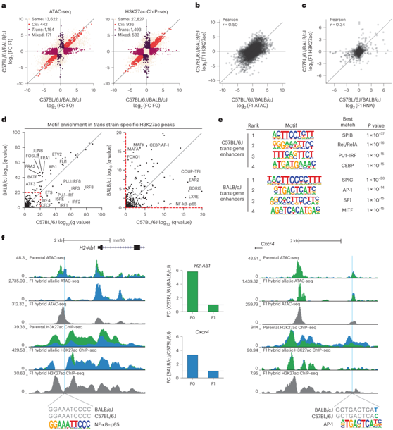 (a) 使用亲代小鼠(x轴)和 F1 杂交小鼠(y轴)的 Kupffer 细胞比较 ATAC-seq(左)和 H3K27ac ChIP-seq(右)的比率。 (b) IDR ATAC-seq 峰处的等位基因 ATAC-seq 和 H3K27ac ChIP–seq 读数的相关性。(c) 至少一个样本中 TPM > 4 表达的转录本的等位基因 RNA-seq 读数和启动子 H3K27ac ChIP-seq 读数的相关性以及具有超过 8 个 H3K27ac ChIP-seq 读数的启动子。(d) 反式BALB/cJ特异性增强子(y轴)和反式C57BL/6J H3K27ac增强子(x轴)中转录因子基序的富集得分。 (e) 与C57BL/6J或BALB/cJ转基因相关的活性增强子的从头基序富集。(f) 反式调节基因上游的反式调节表观遗传基因座的例子。