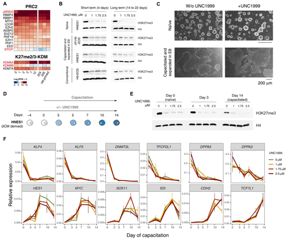 接下来,他们使用 EZH1/2 抑制剂 (UNC1999) 处理初始 HNES1、获能 HNES1 和 cR-H9-EOS 以及常规引发的 H9-EOS。用不同浓度(1 μM、1.75 μM和2.5 μM)的UNC1999抑制剂处理4天或更长时间后,H3K27me3整体减少(图3B)。这种抑制也没有引起幼稚或引物hPSC中多能性标记物表达的实质性变化。此外,在UNC1999抑制剂的存在下延长传代14至22天,细胞形态没有改变(图3C),也没有影响多能因子的表达。他们在幼稚HNES1中敲除H3K27me3,并在UNC1999存在的情况下进行获能(图3D),H3K27me3在整个获能过程中仍然显著减少(图3E)。