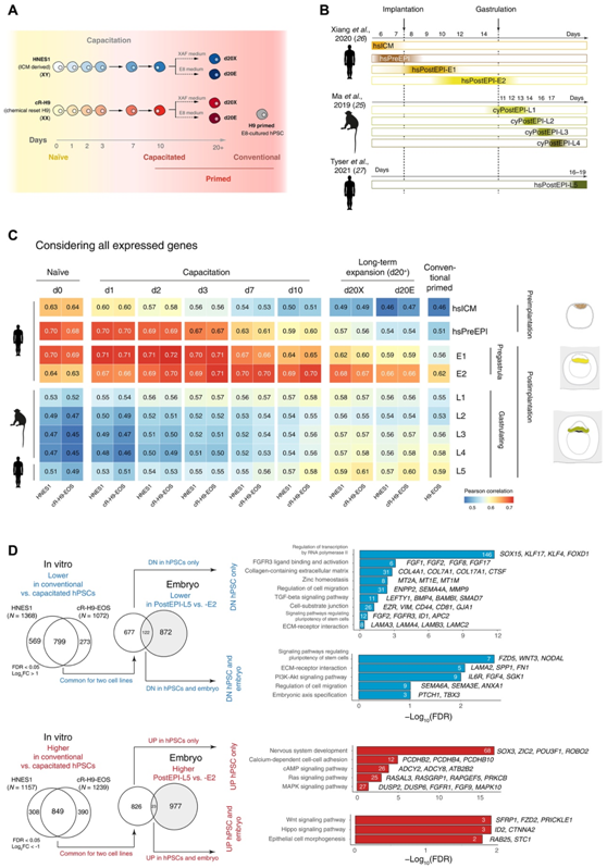 (A) 获能过程中 RNA-seq 的实验方案。(B) 用于比较的胚胎的单细胞 RNA-seq 数据,与发育时间一致。(C) 使用所有表达基因计算的体外获能过程中的 hPSC 与不同发育阶段的胚胎外胚层之间的 Pearson 相关性。(D) 获能 hPSC 和传统 hPSC 之间不同的基因组与胚胎外胚层进展过程中动态表达的基因的比较。