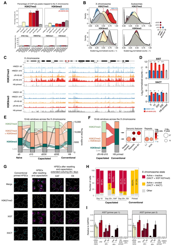 X 染色体失活由长 ncRNA XIST和XACT以及组蛋白修饰调节:活性 X 染色体在有或没有XIST的情况下被XACT结合,而失活的 X 染色体被XIST包被并表现出高 H3K27me3 水平。在传统引发的 H9-EOS 雌性细胞中,映射到 X 染色体的 H3K27me3 峰的百分比较低,与雄性 HNES1 细胞相当。同时,与其余细胞相比,传统引发的 H9-EOS 中映射到 X 染色体的 H3K9me3 峰的百分比更高(图 6A -C)。这些差异仅在X染色体中观察到,而在常染色体中未观察到,进一步证实了X染色体侵蚀。出乎意料的是,在对常规引发的H9-EOS进行重置和获能后,X染色体上的H3K27me3的峰的百分比增加,而H3K9me3的峰的百分比降低,这表明破坏的X染色体在获能过程中恢复到一个与失活相关的表观遗传景观。
