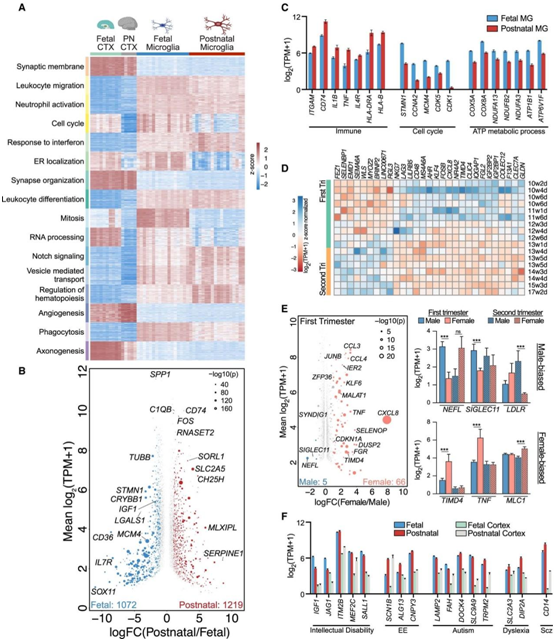 在妊娠早期发现了 71 个常染色体差异表达基因,其中免疫相关基因[(例如肿瘤坏死因子 (TNF) 、CCL3]的表达在女性小胶质细胞中高于男性(图 1 E)。此外,对小胶质细胞和整个大脑皮层(CTX) 中具有遗传变异的神经发育障碍(ndd) 相关基因的差异表达分析表明,许多与智力障碍[自闭症、溶酶体贮积症和精神分裂症 (Scz)]相关的基因,优先在小胶质细胞中表达(图 1 F)。综上所述,胎儿小胶质细胞可能在多种 NDD 中发挥重要作用。