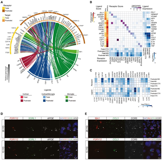 (A) Circos 图显示 NicheNet 对目标基因配体的预测以及胎儿和出生后小胶质细胞中预测的受体。(B) 热图描绘了 (A) 中所示的配体活性评分(左)和配体-受体相互作用评分(中)以及配体(右)和受体(下)的 RNA 表达。(C) 人胎儿体皮质、出生后体皮质、胎儿小胶质细胞和出生后小胶质细胞之间配体-受体对的基因表达热图。(D) 人类产后大脑多荧光 RNAscope 的 3 个独立实验的代表性图像。(E) 3 个独立实验多荧光 RNAscope 探测P2RY12(红色)或 IHC 探测 IBA1(红色)、CCL3(绿色)、CCR5(白色)和 DAPI 的人产后大脑的代表性图像。