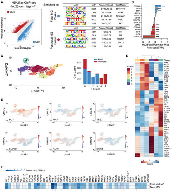 (A)(左)H3K27ac ChIP-seq信号在远端[距离转录起始位点(TSS) >1000 bp]ATAC-seq峰附近的散点图。(右)胎儿(上)或出生后(下)小胶质细胞差异乙酰化区域的基序分析。(B) 条形图显示基序的候选 TF 的 log2FC,蓝色的 TF 在胎儿小胶质细胞中表达较高,红色的 TF 在出生后小胶质细胞中表达较高。(C)(左) UMAP可视化。(右)条形图显示胎儿和产后对每个聚类的相对贡献。(D) 每个基序和每个聚类的平均 chromVAR 得分的热图。(E) 使用 chromVAR 对指示基序的富集进行 UMAP 可视化。(F) 在胎儿和出生后小胶质细胞中确定的 TF 最佳匹配基序的基因表达热图。