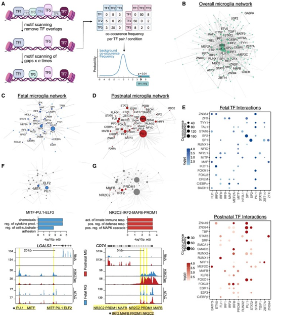 (A) 从基序共现网络 (TIMON) 推断转录因子相互作用的示意图。(B) 所有小胶质细胞(胎儿和产后)的 TIMON 分析。(C) 胎儿小胶质细胞特异性增强子基序共现网络。(D) 出生后小胶质细胞特异性增强子基序共现网络。(E) 胎儿和出生后小胶质细胞中显著同时发生的转录因子对的气泡图。(F) MITF-PU.1-ELF2(上)是胎儿小胶质细胞网络的 TF。(中)GO分析 。(下)胎儿(蓝色)和出生后小胶质细胞(红色)中LGALS3的表达以及与LGALS3相关的相应 ATAC-seq 和 H3K27ac ChIP-seq 峰。(G) NR2C2-IRF2-MAFB-PRDM1(上)是出生后小胶质细胞网络的一个团。(中)与包含 NR2C2-IRF2-MAFB-PRDM1 的增强子相关的基因的 GO 分析。(下)UCSC 浏览器跟踪显示胎儿(蓝色)和出生后小胶质细胞(红色)中CD74的表达以及与CD163相关的相应 ATAC-seq 和 H3K27ac ChIP-seq 峰。