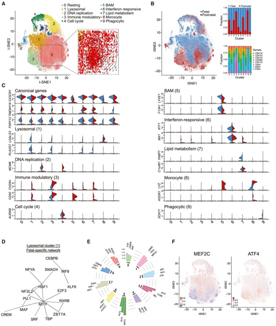 TF 活性分析 (TFAct)显示,MiTF-TFE 家族成员 TFE3 对溶酶体聚类 1 显示出最强的活性(图 5 E-F)。他们还检测到MEF2C的高TF活性,当映射到t分布随机邻居嵌入(tSNE)投影时,显示出与胎儿小胶质细胞占主导的聚类的紧密结合(图5F)。MEF2C 缺失的小胶质细胞加剧了炎症后的免疫反应,而小胶质细胞中 MEF2C 的杂合性缺失会导致与自闭症相关的行为缺陷,表明小胶质细胞-MEF2C 在介导小胶质细胞功能塑造早期大脑发育中发挥作用。