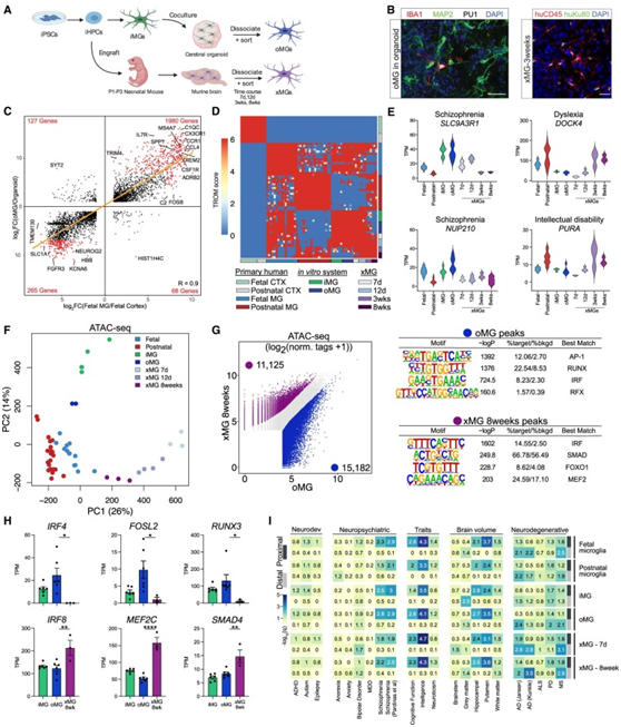 (A)从 iPSC 衍生出 HPC、iMG、oMG 和 xMG的示意图。(B) 免疫组织化学分析。(C) 基因比率图,比较 oMG 相对于大脑类器官之间基因表达的 FC 与胎儿小胶质细胞相对于胎儿皮质之间基因表达的 FC。(D) 胎儿和出生后小胶质细胞和皮质、iMG、oMG 和 xMG 转录组的 TROM 对应图。(E) 与指定神经发育障碍相关的基因表达小提琴图。(F) 原代人小胶质细胞、体外iPSC 模型和体内xMG 的远端 ATAC-seq 峰的 PCA 图。(G)(左)远端 ATAC-seq 峰的散点图。(右)oMG(上)和 xMG(下)中差异可及区域的从头基序分析。(H) 已知与 (G) DNA 基序结合的 TF 表达的条形图。(I)遗传变异体富集的 LDSC 分析热图。