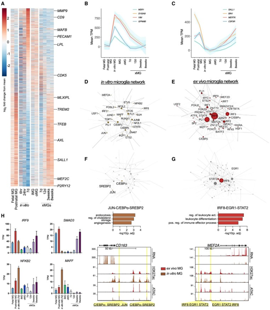 (A) 人类原代小胶质细胞和 iPSC 系统中环境依赖性基因的基因表达变化热图。(B) 与离体小胶质细胞相比,体外小胶质细胞中增加的小胶质细胞基因的平均 TPM。(C) 在 xMG 中恢复表达的环境依赖性小胶质细胞基因的平均 TPM。(D)体外人小胶质细胞的转录因子网络。(E) 源自 TIMON 的离体人小胶质细胞的转录因子网络。(F) JUN-C/EBPα-SREBP2(上)是体外小胶质细胞网络的一个团。(中)与含有 JUN-C/EBPα-SREBP2 的增强子相关的基因的 GO 分析。(下)体外(棕色)和离体小胶质细胞(红色)中CD163的 RNA 表达以及与CD163相关的相应 ATAC-seq 和 H3K27ac ChIP-seq 峰。(G) IRF8-EGR1-STAT2(上)是离体小胶质细胞网络的一个团。(中)与包含 IRF8-EGR1-STAT2 的增强子相关的基因的 GO分析。(下)体外(棕色)和离体小胶质细胞(红色)中MEF2A的 RNA 表达以及相应的 ATAC-seq 和 H3K27ac ChIP-seq 峰。(H) 选择大脑环境调节的 TF 表达的条形图。