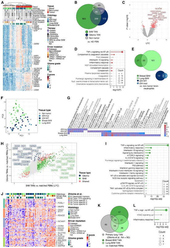 (A) 热图显示了前 250 个变化最大的中性粒细胞基因。(B) 欧拉图显示 BrM/神经胶质瘤 TAN 和非肿瘤脑中性粒细胞与 HD PBN 中上调差异表达基因 (DEG) 的交集。(C)火山图显示非肿瘤脑中性粒细胞与HD pbn中的deg。(D) Hallmark、KEGG和Reactome数据库对非肿瘤脑中性粒细胞、胶质瘤和BrM TAN与HD pbn之间共有的上调deg通路的过度代表性分析(ORA)。(E) 欧拉图显示了肺、乳腺 BrM、IDH WT 和IDH mut 神经胶质瘤 TAN 与非肿瘤脑中性粒细胞中上调 DEG 的交集。(F) 非(肿瘤)脑组织中中性粒细胞转录谱的 PCA图。(G) 使用 Hallmark 和 Reactome 数据库对肺、乳腺 BrM、IDH mut 和IDH WT 神经胶质瘤 TAN 与非肿瘤脑中性粒细胞中的 DEG 进行基因集富集分析 (GSEA)。(H) 点图描绘 BrM/神经胶质瘤 TAN 与匹配的 PBN 之间各个 DEG 的 LFC。(I) 来自 Hallmark、KEGG 和 Reactome 数据库的前 20 个最重要通路的 ORA。(J) 热图显示了每个“N”中性粒细胞聚类中与前 10 个最可变基因对齐的非肿瘤中性粒细胞和脑 TAN。(K) 欧拉图显示了肺和乳腺 BrM TAN 与匹配的 PBN 中上调的前 100 个 DEG 之间的交叉。(L) 来自 Hallmark、KEGG 和 Reactome 数据库的重要通路的 ORA,仅在乳腺和肺 BrM TAN 之间共有的 27 个 DEG。
