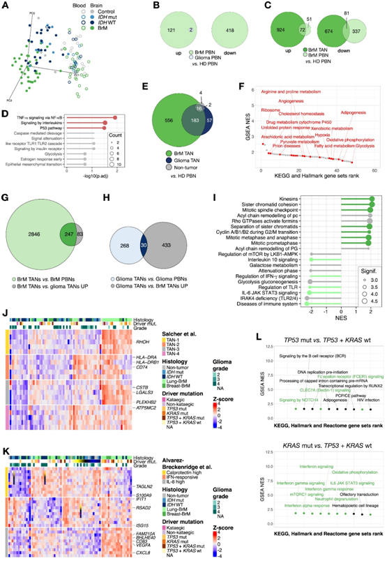 (A) 基于 1% 最可变基因的血液(空心圆圈)和脑(肿瘤)组织(实心圆圈)中性粒细胞转录谱的PCA。(B) 欧拉图显示神经胶质瘤和 BrM 与HD PBN 中上调和下调差异表达基因 (DEG) 的重叠。(C) 欧拉图描绘了 BrM TAN 和 PBN 与 HD PBN 中上调和下调 DEG 的交集。(D) KEGG 和 Reactome 数据库中 BrM PBN 和 TAN 与 HD PBN 之间共享的上调 DEG 路径的过度代表性分析 (ORA)。(E) 欧拉图显示 BrM 和神经胶质瘤 TAN 以及非肿瘤脑中性粒细胞与 HD PBN 中下调的 DEG 的交集。(F) 使用非肿瘤脑中性粒细胞与 HD PBN 的 KEGG 和 Hallmark 数据库进行基因集富集分析 (GSEA)。(G) 欧拉图显示 BrM 与神经胶质瘤 TAN 和 BrM TAN 与匹配 PBN 的交集。(H) 欧拉图描绘了神经胶质瘤与 BrM TAN 以及神经胶质瘤 TAN 与匹配的 PBN 的交集。(I) 使用 Hallmark、KEGG 和 Reactome 数据库对肺 vs 中的 DEG 进行排名前 10 的重要通路。(J)描绘非肿瘤中性粒细胞和脑tan与Salcher定义的每聚类前5个最可变基因对齐的热图,(K) 公开scRNA-seq数据集定义的每聚类前10个最可变基因。(L) GSEA使用Hallmark、KEGG和Reactome数据库分析KRAS突变体与WT、TP53突变体与WT肺-brm分离的TAN中的DEG。