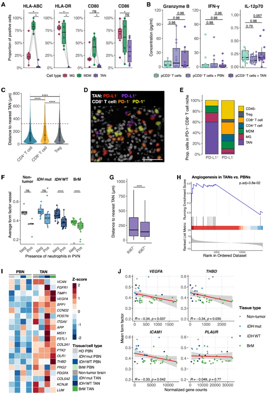 (A) 匹配的 MDM、MG 和 TAN 中表达抗原呈递分子的细胞比例。(B) 外周 CD3 + T 细胞 (pCD3) 与 PBN/TAN共培养上清液中的细胞因子浓度 (pg/mL)。(C) BrM和IDH WT胶质瘤中单个T细胞(CD4+ T细胞、CD8+ T细胞、Treg细胞至最近TAN的距离。(D) 代表性肺 BrM 图像显示 TAN (PD-L1-/PD-L1+) 和 CD8+ T 细胞 (PD-1- /PD-1+)的 IF 细胞类型定量。(E) BrM和IDH WT 神经胶质瘤中 PD-1 + CD8 + T 细胞周围 20 μm 半径内鉴定的细胞类型的平均比例。(F) 基于 IF,PVN 中存在 (Pos) 或不存在 (Neg) 中性粒细胞的单个血管的平均形状因子。(G) Ki67 −和 Ki67+内皮细胞到最近 TAN 的距离 (μm)。(H) 神经胶质瘤中 Hallmark 血管生成途径的 GSEA 和 BrM TAN 组合,与匹配的 PBN 进行比较。(I) 按脑组织类型和 PBN/TAN 分层的前沿 Hallmark 血管生成通路中各个基因的热图。(J) 平均血管形状因子与脑(肿瘤)中性粒细胞中血管生成相关基因的标准化基因计数之间的相关性。