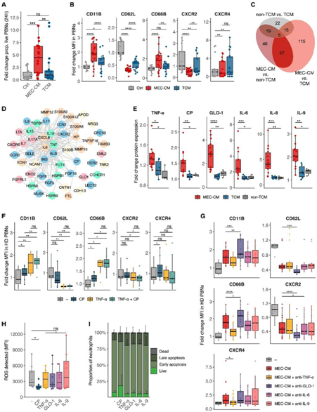 (A) HD PBN 存活率与对照组相比的差异倍数。(B) HD PBN 中指示标记的 MFI 差异倍数。(C) 欧拉图描绘了 MEC-CM、TCM 和非 TCM 之间差异检测到的蛋白质的重叠。(D) MEC-CM 与 TCM 和非 TCM 中 51 个差异表达蛋白的蛋白质相互作用网络。(E) 蛋白质水平量化。(F) 在用 TNF-α 和/或 CP 处理的 HD PBN中检测的指示标记物的MFI。(G) 在 MEC-CM中培养的 HD PBN和指定抑制剂中指定蛋白质的差异倍数。(H) 在用 MEC-CM 特异性介质处理的 HD PBN中检测到 ROS 水平。(I)用MEC-CM特异性可溶性因子处理后不同活力阶段的PBN的比例。