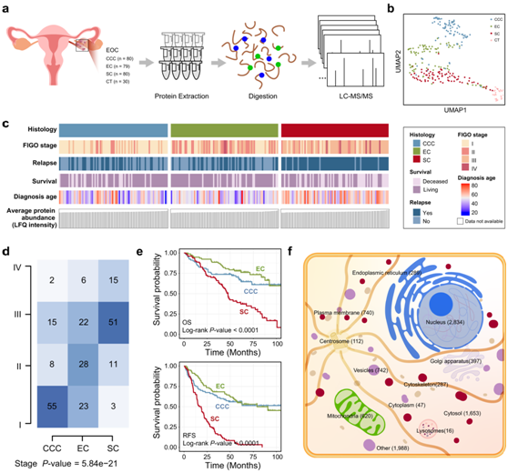 (a) 基于 MS 的蛋白质组分析流程。 (b) 上皮性卵巢癌 (EOC) 肿瘤和对照组织 (CT) 样本的 UMAP 图。(c) 热图显示样品的临床信息和平均蛋白质丰度。(d) EOC 组织学亚型丰度在肿瘤分期方面的差异。(e) EOC组织学亚型的总生存期 (OS)和无复发生存期 (RFS)的 Kaplan-Meier 图。(f) 蛋白质亚细胞定位示意图。