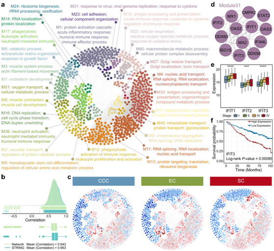 (a) 具有 896 个节点和 13574 个边的蛋白质共表达网络。(b) 网络中显示的相互作用的成对蛋白质-蛋白质相关性的密度图。(c) 每个组织学亚型的异常蛋白表达水平叠加在网络上。(d) Module 31 的子网。 (e) 箱线图显示IFIT1、IFIT2和IFIT3在不同组织学亚型中的丰度。(f) IFIT3 的 Kaplan-Meier 生存曲线。