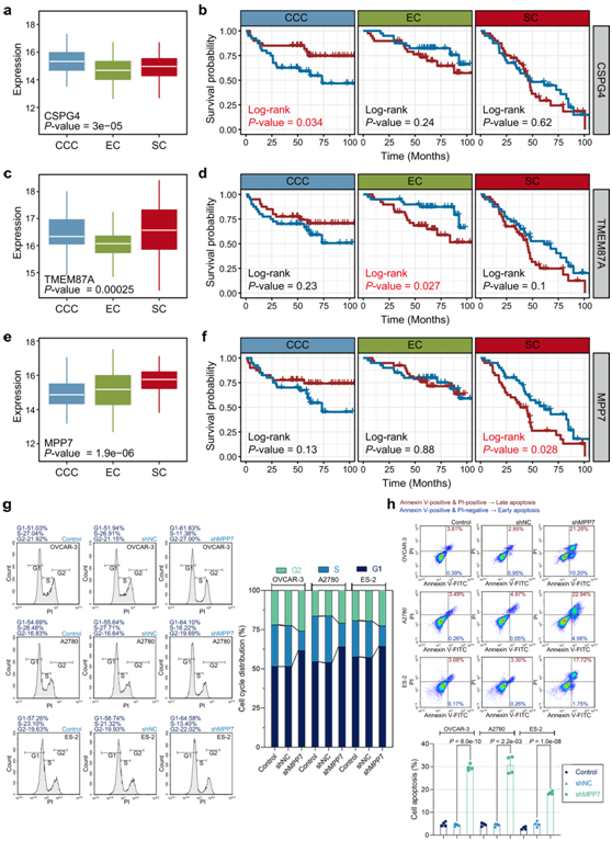 (a,c,e) CSPG4、TMEM87A 和 MPP7 在各自组织学亚型中的表达水平。 (b,d,f)生存曲线分析。(g-h)流式分析。