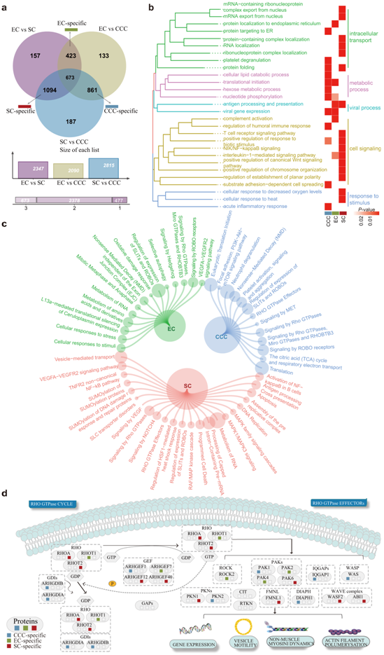 (a) 维恩图显示了不同 EOC 亚型中报道的差异表达蛋白的重叠。(b-c) GO 分析和富含差异表达亚型特异性蛋白质的和分子途径。 (d) 亚型特异性蛋白质在 Rho GTPases 信号转导通路中富集。
