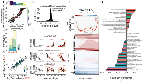 图2. 按细胞类型组成对胚胎进行分期,捕获了温度诱导的发育加速,并可以分离温度依赖性对细胞丰度的影响。