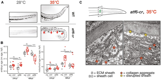 接下来,他们检测了当这些胚胎在高温下升高时,atf6 crispants是否会加剧温度依赖性的蛋白质静态应激。在高温下升高的对照鱼的脊索显示正常,而atf6 crispants组的脊索鞘则出现扭结、弯曲或变形(图5A)。