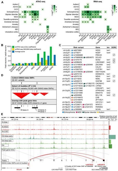 (A) 神经精神疾病和不相关控制特征中脑细胞类型的遗传性富集。(B) 选定神经精神疾病中胎儿和成人神经元信号的比较。(C)风险变异的候选因果基因子集。(D) 将与神经精神疾病相关的风险变异与其致病基因联系起来的总体策略示意图。(E)标准化的snATAC-seq衍生的pseudobulk轨迹展示了DCLK3基因的复杂细胞特异性调节,预测该基因为SCZ和BD GWAS风险变异的致病基因(rs75968099和rs75968099)。